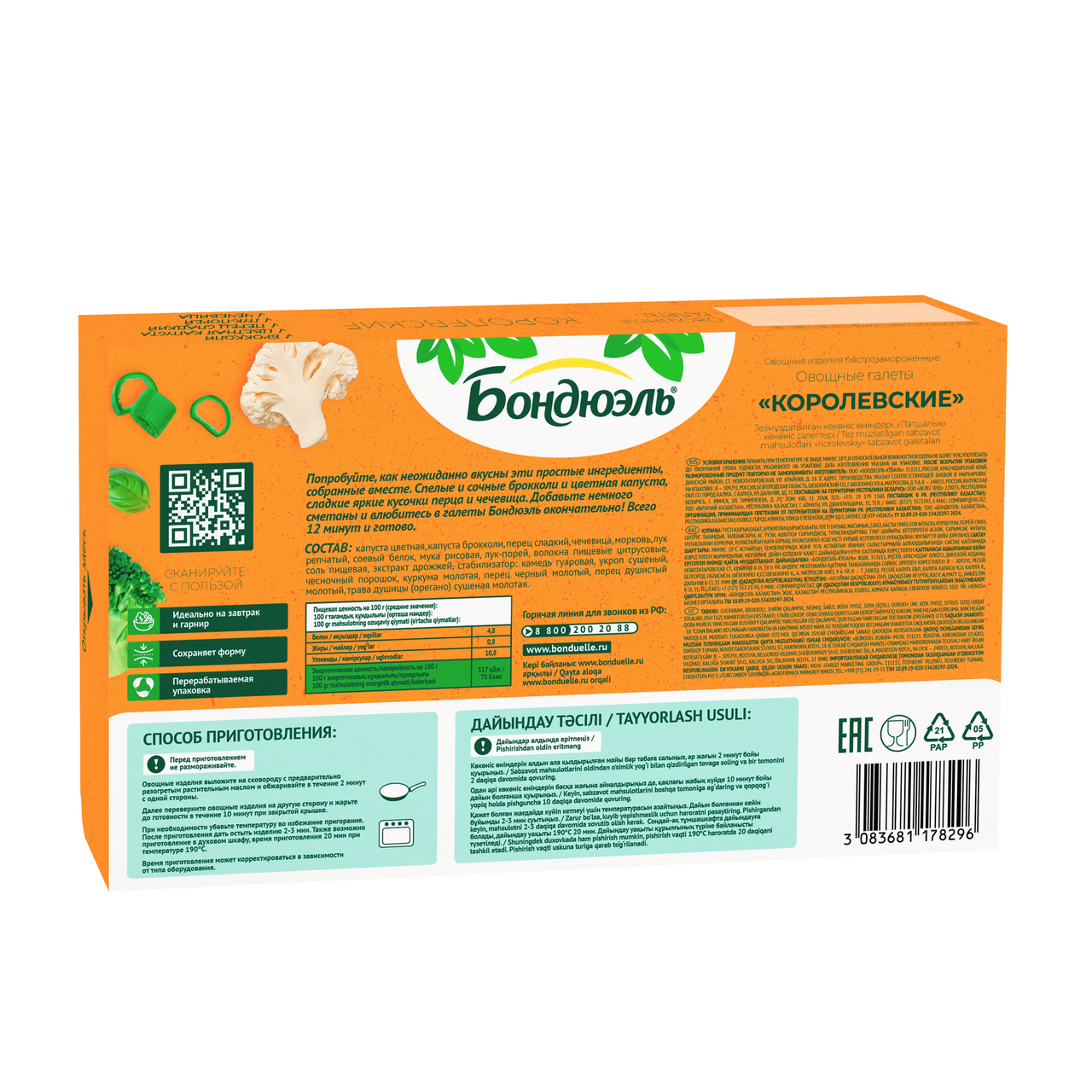 Галеты Бондюэль - это возможность легко ввести в меню овощи, богатые витаминами, минералами и клетчаткой. Микс цветной капусты, брокколи, сладкого перца, чечевицы, моркови и ароматных специй. Достаете из пачки не размораживая, обжариваете 7 минут на сковороде - и полезный ужин готов. Кстати, галеты можно есть и на завтрак, добавив их на тарелку к привычной яичнице.