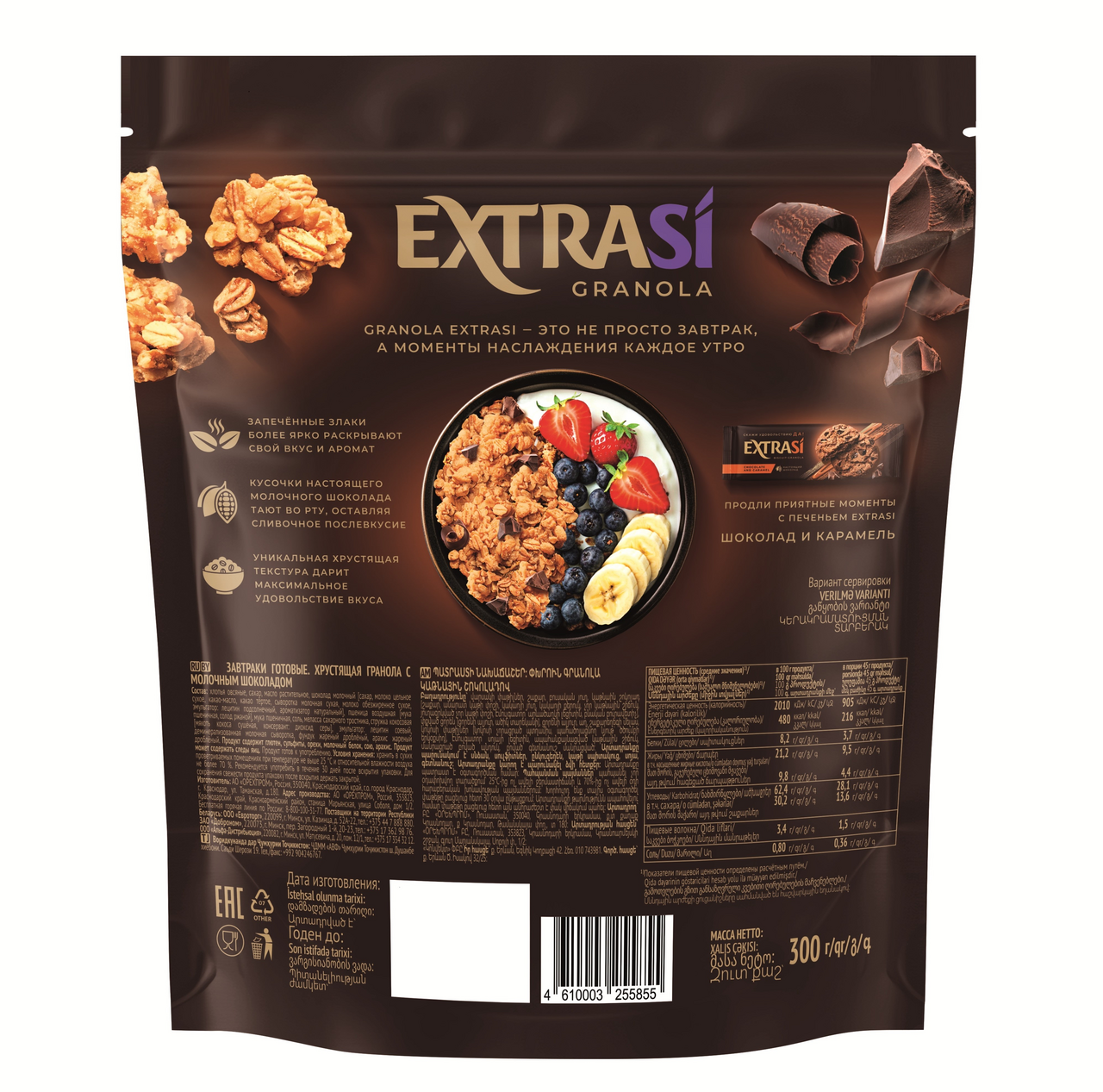 Гранола EXTRASI – это неповторимое сочетание вкуса и премиальных ингредиентов, которые приносят невероятное наслаждение. Восхитительный микс из овсяных хлопьев, хрустящего воздушного риса, кусочков молочного шоколада подарят моменты истинного удовольствия. Поможет пополнить запасы сил и энергии и внесет приятное разнообразие в привычное меню. Прекрасно подойдут для вкусного и быстрого завтрака или неповторимого перекуса в течение дня. Содержит клетчатку. Удобный замок зип-лок надолго сохранит свежесть мюсли. Гранола EXTRASI – это не просто завтрак, а моменты наслаждения каждое утро. Скажи удовольствию ДА.