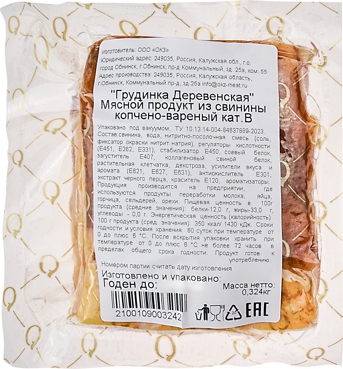 Грудинка Обнинский Деревенская копчено-вареная, 300г