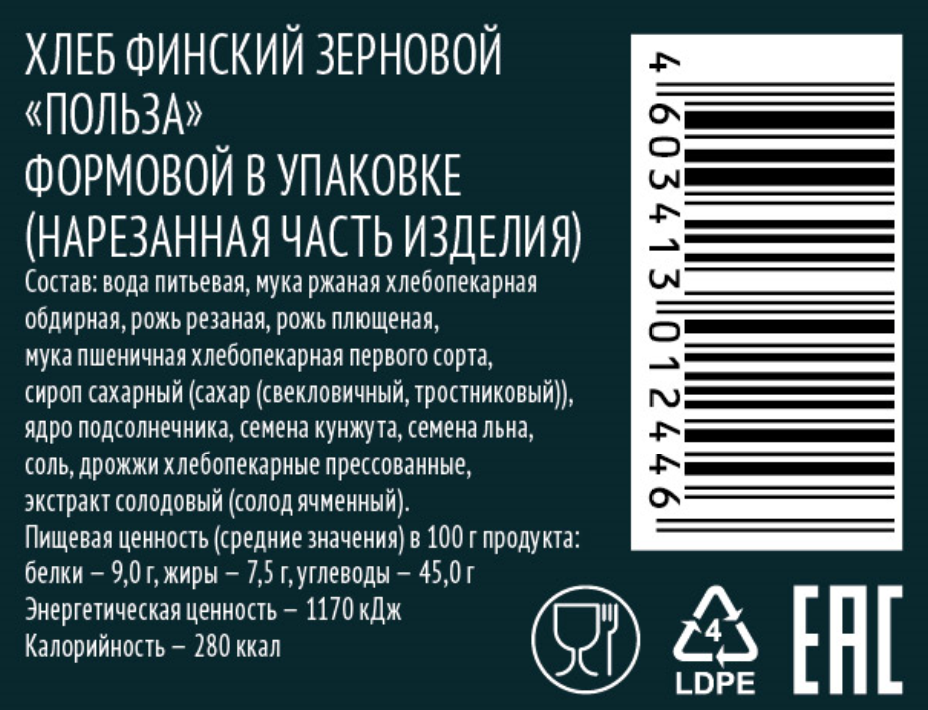 Зерновой финский хлеб с ржаным резаным зерном. Благодаря минимальной обработке злаки максимально сохраняют в себе необходимые организму микроэлементы и витамины. Семена льна, подсолнечника и кунжута делают хлеб еще полезнее!