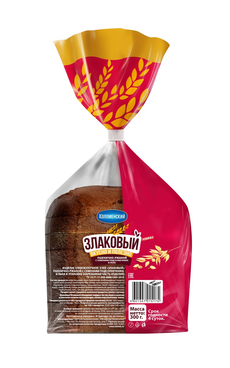 Хлеб Коломенский злаковый пшенично-ржаной с семенами подсолнечника и льна, 300г