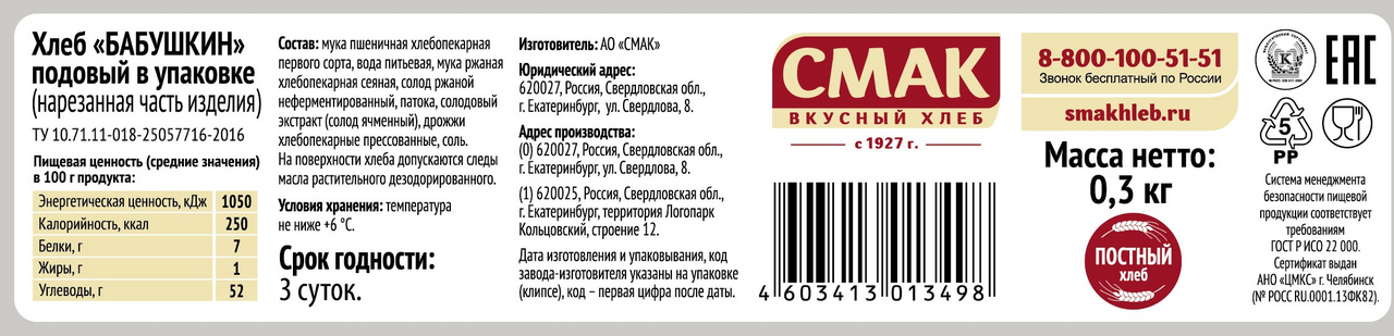Отличительная особенность хлеба Бабушкин – насыщенный кофейный цвет и приятный аромат ржаного солода. Замешивается на традиционных заквасках. Выпекается на площадке Кольцово на новом технологическом оборудовании. Буханка выпекается весом 20 кг и длиной 2,5 метра. Такой размер позволяет хлебу накапливать больше вкуса, пользы и аромата. Каменный под позволяет сохранить хлеб пышным, сформировать необходимую форму, а стальной под и несколько температурных режимов выпекания обеспечивают насыщенный вкус и аромат.