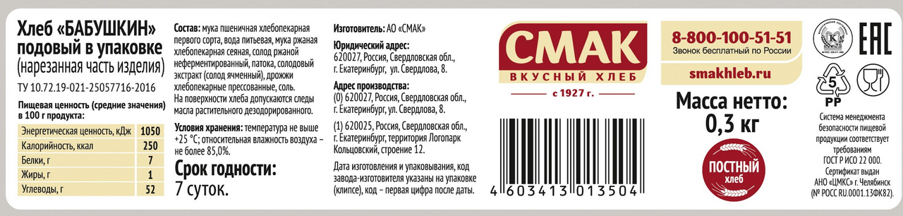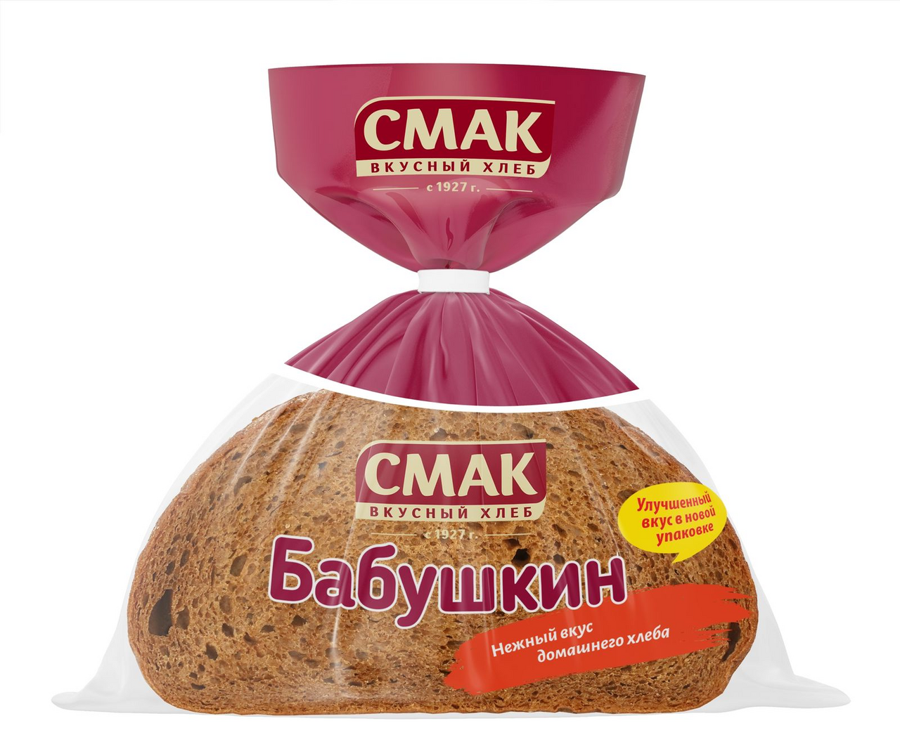 Хлеб Смак бабушкин нарезной, 300г - отличительная особенность хлеба Бабушкин – насыщенный кофейный цвет и приятный аромат ржаного солода. Замешивается на традиционных заквасках. Выпекается на площадке Кольцово на новом технологическом оборудовании. Буханка выпекается весом 20 кг и длиной 2,5 метра. Такой размер позволяет хлебу накапливать больше вкуса, пользы и аромата. Каменный под позволяет сохранить хлеб пышным, сформировать необходимую форму, а стальной под и несколько температурных режимов выпекания обеспечивают насыщенный вкус и аромат.