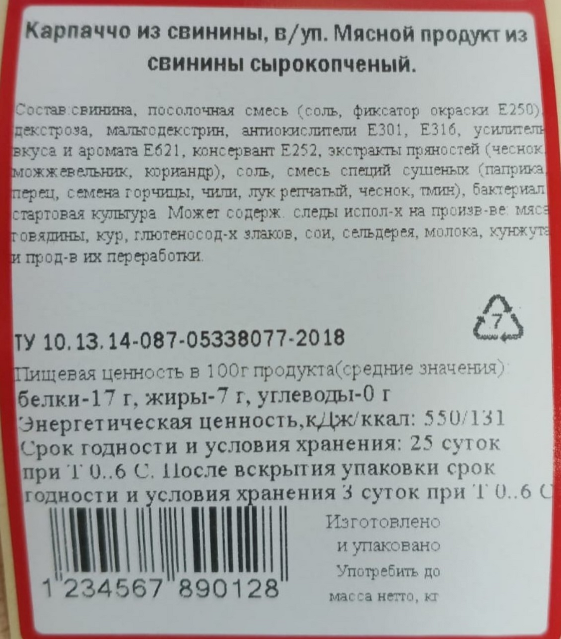 Свинина, шпик, говядина, посолочно-нитритная смесь соль, фиксатор окраски Е250, загустители: Е1422, Е1442, Е1200; декстроза, овощи молотые чеснок, лук, перец черный молотый, усилитель вкуса и аромата Е621, регулятор кислотности Е451, соль, мальтодекстрин, ароматизаторы (в том числе коптильный ароматизатор), экстракт белого перца, антиокислитель Е301, дрожжевой экстракт, белок говяжий, стабилизаторы Е450, Е452, крахмал картофельный, антиокислитель Е316, краситель Е120, сахар.
