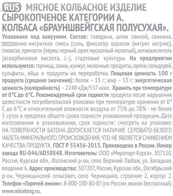 Колбаса Мираторг Брауншвейгская сырокопченая полусухая, 300г станет отличным дополнением к любому торжественному застолью. Ее отличает пикантный, в меру соленый вкус, зернистая текстура и легкий аромат копчения. Колбасу можно нарезать тонкими слайсами и использовать для приготовления канапе или подачи в составе мясной тарелки. Она хорошо сочетается с различными напитками. Ее можно подавать со свежим или поджаренным хлебом, вялеными томатами, оливками, сырыми овощами, маринованными огурчиками. За счет высокой энергетической ценности она быстро утоляет чувство голода и дарит источник энергии.