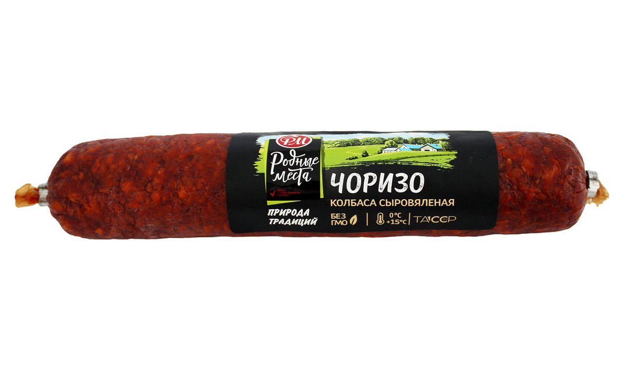 Пикантная свиная сыровяленая колбаса родом из Испании и Португалии. Чоризо также популярна в странах Латинской Америки. Основной пряностью, используемой при приготовлении чоризо, является паприка, которая придаёт колбасе типичный вкус и красноватый цвет. Мясо для фарша обычно мелко перемалывают. Подойдет для украшения мясной праздничной тарелки или для приготовления закусок.