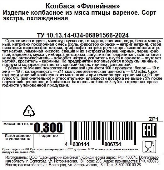 Изделие колбасное из мяса птицы вареное. Это мясной продукт с нежной текстурой и сбалансированным вкусом. Изготовлена из отборного филейного мяса с добавлением специй. Отличается сочностью и приятным ароматом. Подходит для бутербродов, закусок, салатов, домашней пиццы. Является источником белка, помогает быстро утолить голод, придает сил. Это традиционный элемент повседневного меню.
