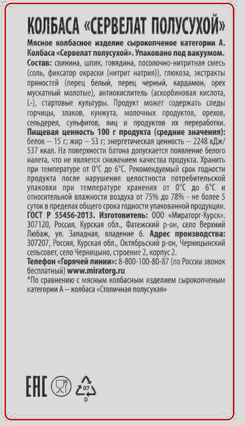 Приготовлена строго по ГОСТу из мяса собственного производства: отборной свинины, мраморной говядины Black Angus и натурального шпика с добавлением пряного мускатного ореха и душистого белого перца. Отличается зернистой структурой с мелкими кусочками шпика на срезе. Сырокопченая колбаса обладает насыщенным вкусом с пряными нотками муската и ароматом копчения. Первая колбаса Мираторг с м��аморной говядиной Black Angus – еще больше мяса и нет лишней соли.