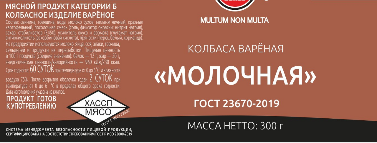 Свинина, говядина, вода, молоко сухое, меланж яичный, крахмал, посолочная смесь соль, фиксатор окраски: нитрит натрия, сахар, стабилизатор Е450, усилитель вкуса и аромата глутамат натрия, антиокислитель аскорбиновая кислота, пряности перец белый, кориандр.