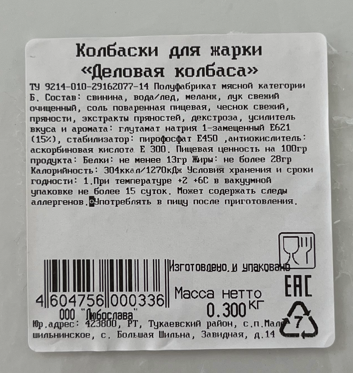 Колбаски для жарки Любослава Деловая колбаса, 300г
