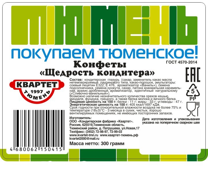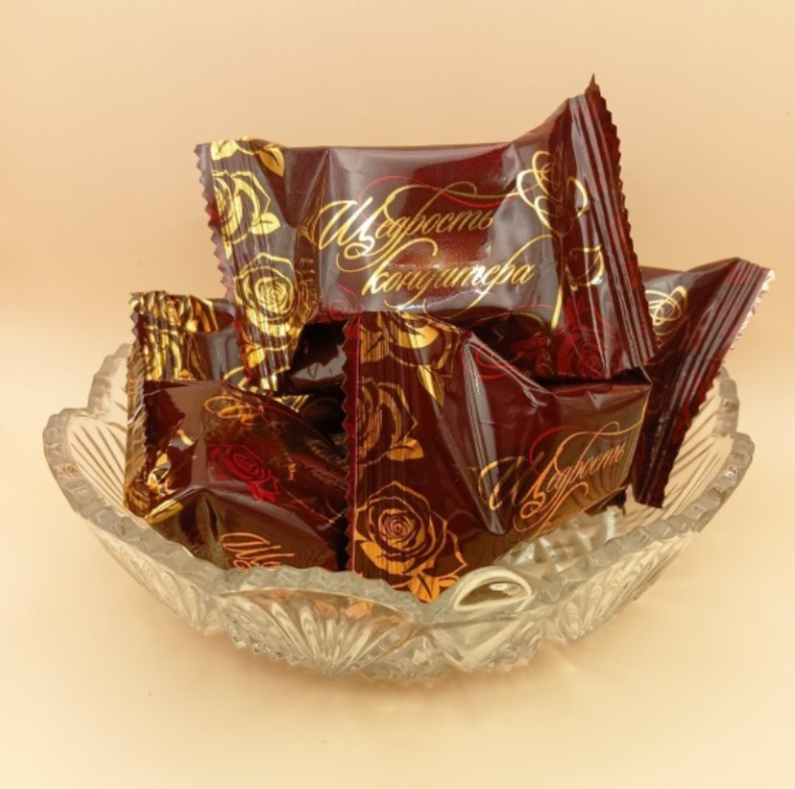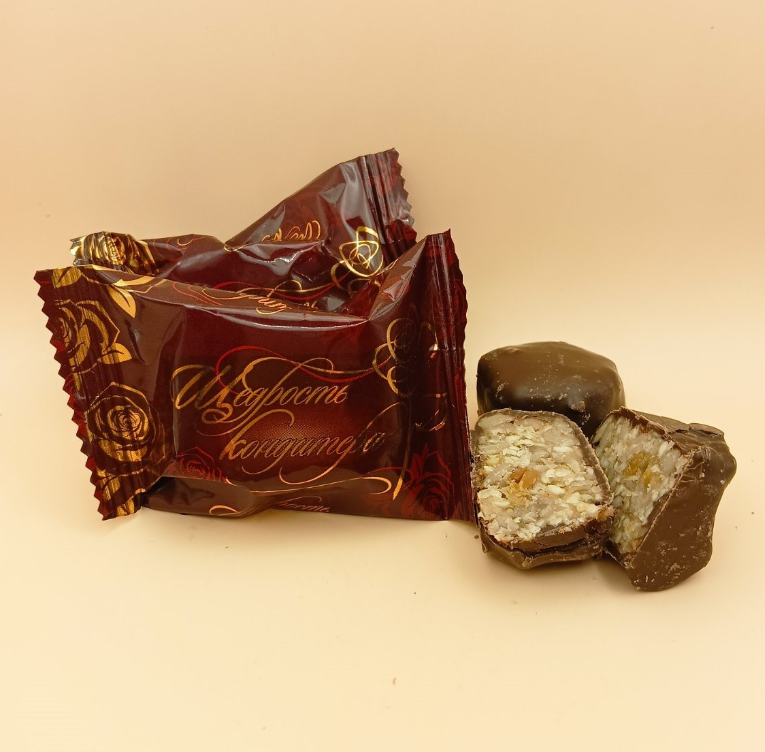 Конфеты круглой формы, глазированные кондитерской глазурью, с мягким грильяжным корпусом на основе дробленых семян подсолнечника, ядра арахиса и семян кунжута. Ассорти из конфет: Щедрость кондитера, Квартетки, Изюминка Квартета, Ореховый восторг, Шоколадные сердечки с цукатом вишни.