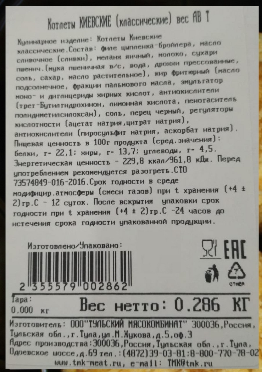 Филе цыпленка-бройлера, масло сливочное (сливки), меланж яичный, молоко, сухари пшенич.(мука пшеничная в/с, вода, дрожжи прессованные, соль, сахар, масло растительное), жир фритюрный (масло подсолнечное, фракции пальмового масла, эмульгатор моно- и диглицериды жирных кислот, антиокислители (трет-Бутилгидрохинон, лимонная кислота, пеногаситель полидиметилсилоксан), соль, перец черный, регуляторы кислотности (ацетат натрия,цитрат натрия), антиокислители (пиросульфит натрия, аскорбат натрия).
