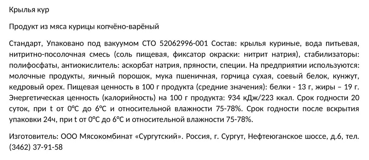 Крылья куриные, вода питьевая, нитритно-посолочная смесь (соль пищевая, фиксатор окраски: нитрит натрия), стабилизаторы: полифосфаты, антиокислитель: аскорбат натрия, пряности, специи.