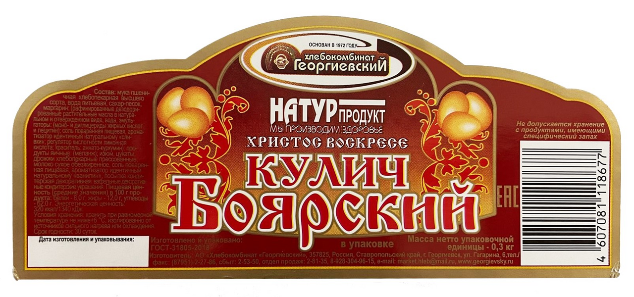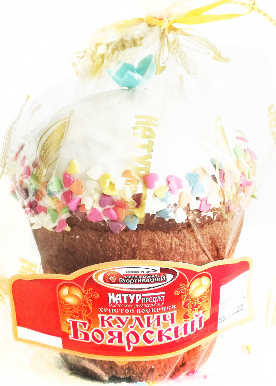 Кулич из пышного сдобного теста дополненного сладчайшим изюмом и цветными цукатами. Поверхность кулича покрыта белой помадкой и украшена мастичными фигурками ручной работы. Оригинальная выпечка, приготовленная из нежного в меру сладкого теста с добавлением ванили, изюма и цукатов. Угощение традиционно подается к кофе или семейному чаепитию по поводу праздника Пасхи. Нежнейший Боярский кулич подарит отличное настроение всем без исключения.