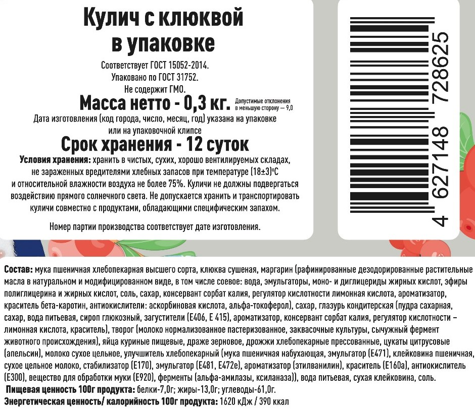 Мука пшеничная хлебопекарная высшего сорта, клюква сушеная, маргарин (рафинированные дезодорированные растительные масла в натуральном и модифицированном виде, в том числе соевое: вода, эмульгаторы, моно- и диглицериды жирных кислот, эфиры полиглицерина и жирных кислот, соль, сахар, консервант сорбат калия, регулятор кислотности лимонная кислота, ароматизатор, краситель бета-каротин, антиокислители: аскорбиновая кислота, альфа-токоферол), сахар, глазурь кондитерская (пудра сахарная, сахар, вода питьевая, сироп глюкозный, загустители (Е406, Е 415), ароматизатор, консервант сорбат калия, регулятор кислотности – лимонная кислота, краситель), творог (молоко нормализованное пастеризованное, заквасочные культуры, сычужный фермент животного происхождения), яйца куриные пищевые, драже зерновое, дрожжи хлебопекарные прессованные, цукаты цитрусовые (апельсин), молоко сухое цельное, улучшитель хлебопекарный (мука пшеничная набухающая, эмульгатор (Е471), клейковина пшеничная, сухое цельное молоко, стабилизатор (Е170), эмульгатор (Е481, Е472e), ароматизатор (этилванилин), краситель (Е160а), антиокислитель (Е300), вещество для обработки муки (Е920), ферменты (альфа-амилазы, ксиланаза)), вода питьевая, сухая клейковина, соль.