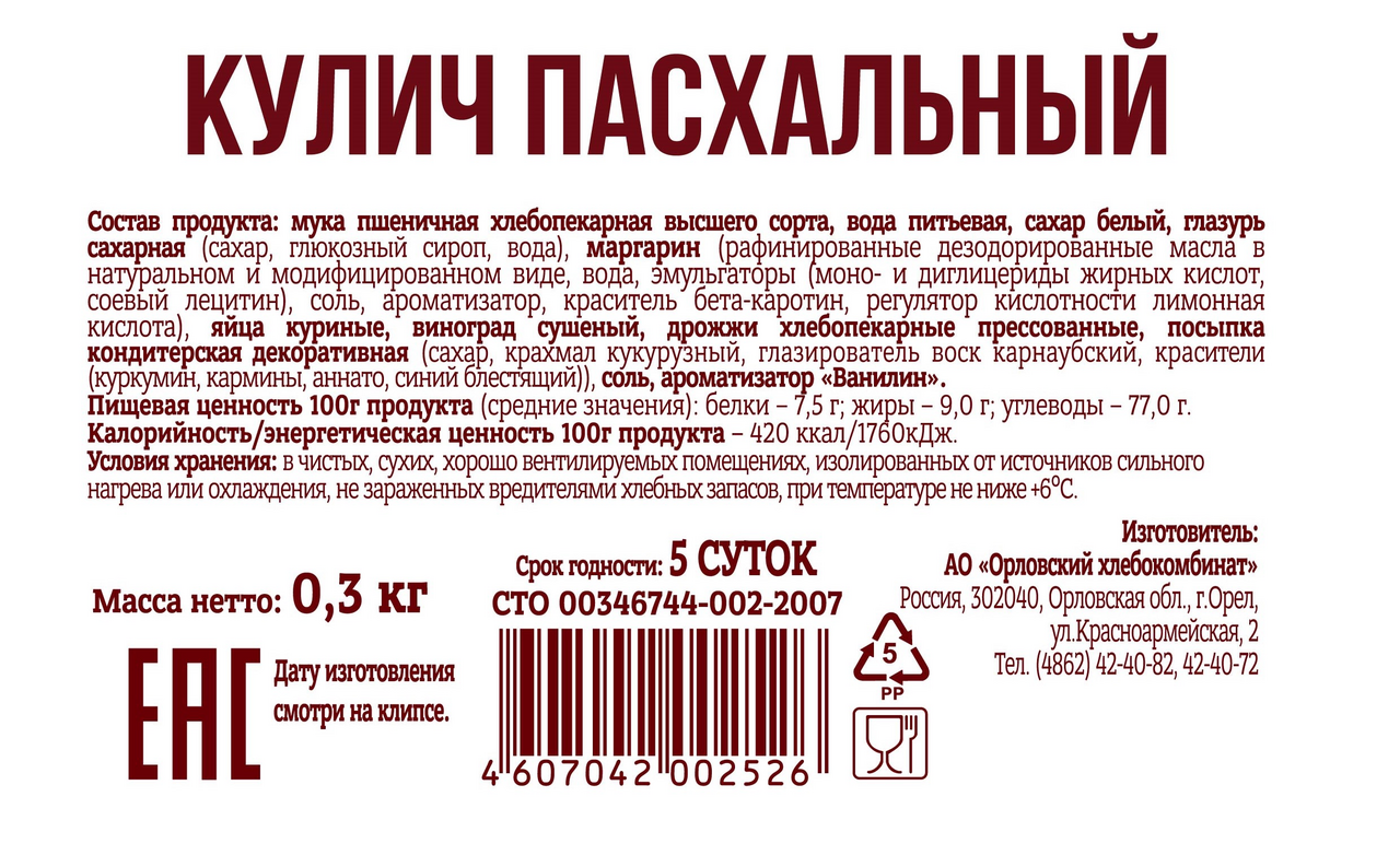 Кулич Орловский ХК Пасхальный, 300г