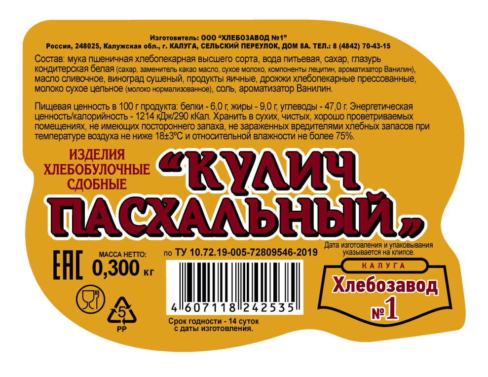 Мука пшеничная хлебопекарная высшего сорта, вода питьевая, сахар, глазурь кондитерская белая, масло сливочное, виноград сушеный, продукты яичные, дрожжи хлебопекарные прессованные, молоко сухое цельное, соль, ароматизатор ванилин.
