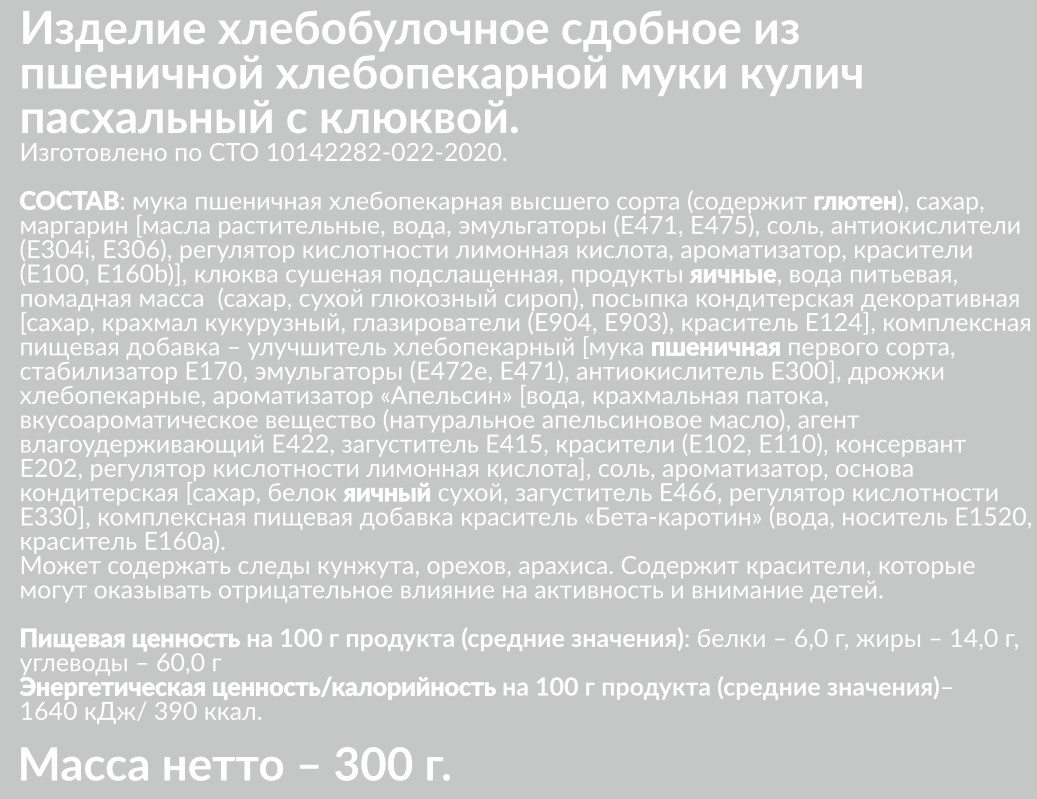 В составе натуральные ягоды клюквы превосходно сочетаются со сладким мякишем. Ароматы ванили подарят ощущение праздника. А яркая красная посыпка сделает его главным элементом любого пасхального стола.