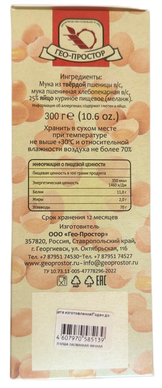 Классическая плоская лапша, изготовленная с добавлением деревенских яиц. Может использоваться для приготовления блюд итальянской кухни, так и для приготовления традиционных среднеазиатских и кавказских блюд. Она отлично сочетается и с насыщенными мясными, и с легкими овощными соусами, а также со сливочными заправками или оливковым маслом, дополненным чесноком и пряными травами.