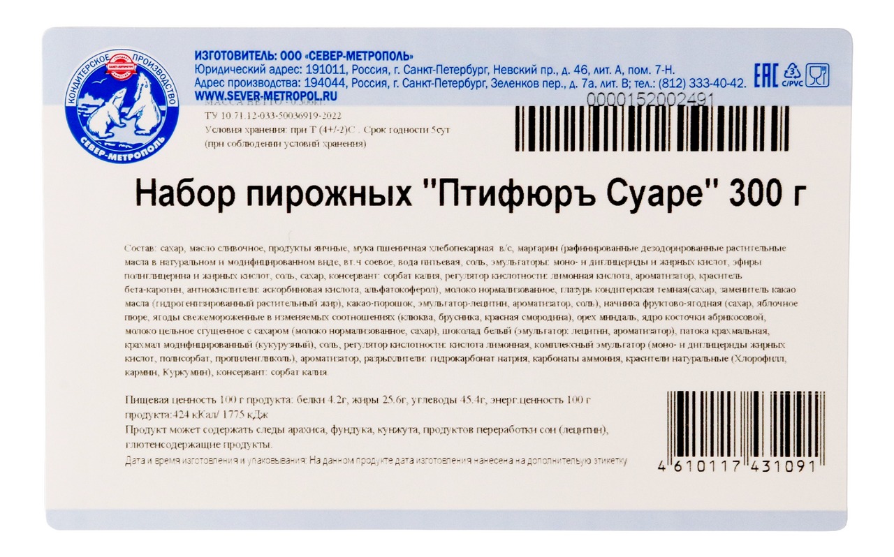 Сахар, масло сливочное, продукты яичные, мука пшеничная хлебопекарная высший сорт, маргарин (рафинированные дезодорированные растительные масла, вода питьевая, соль, эмульгаторы: моно- и диглицериды и жирных кислот эфиры, ароматизатор, идентичный натуральному, регулятор кислотности лимонная кислота, красители натуральные (аннато, куркумин)), глазурь кондитерская белая (сахар, гидрогенизированный растительный жир, сухое обезжиренное молоко, эмульгатор лецитин, ароматизатор, идентичный натуральному), глазурь кондитерская темная (сахар, заменитель какао масла (гидрогенизированный растительный жир), какао-порошок, эмульгатор лецитин, ароматизатор, идентичный натуральному, соль), джем клюквенный (сахар, клюква), косточка абрикосовая, орех миндаль, молоко цельное сгущенное с сахаром (молоко цельное, молоко нормализованное, сахар), патока крахмальная, коньяк, какао-порошок, регулятор кислотности лимонная кислота, сорбат калия, крахмал кукурузный, соль, эмульгаторы: моно- и диглицериды жирных кислот эфиры, разрыхлители: гидрокарбонат натрия, карбонаты аммония, краситель натуральный Кармин, Паприка, Хлорофил, Куркумин, ароматизаторы натуральные и идентичные натуральным, консервант сорбат калия.