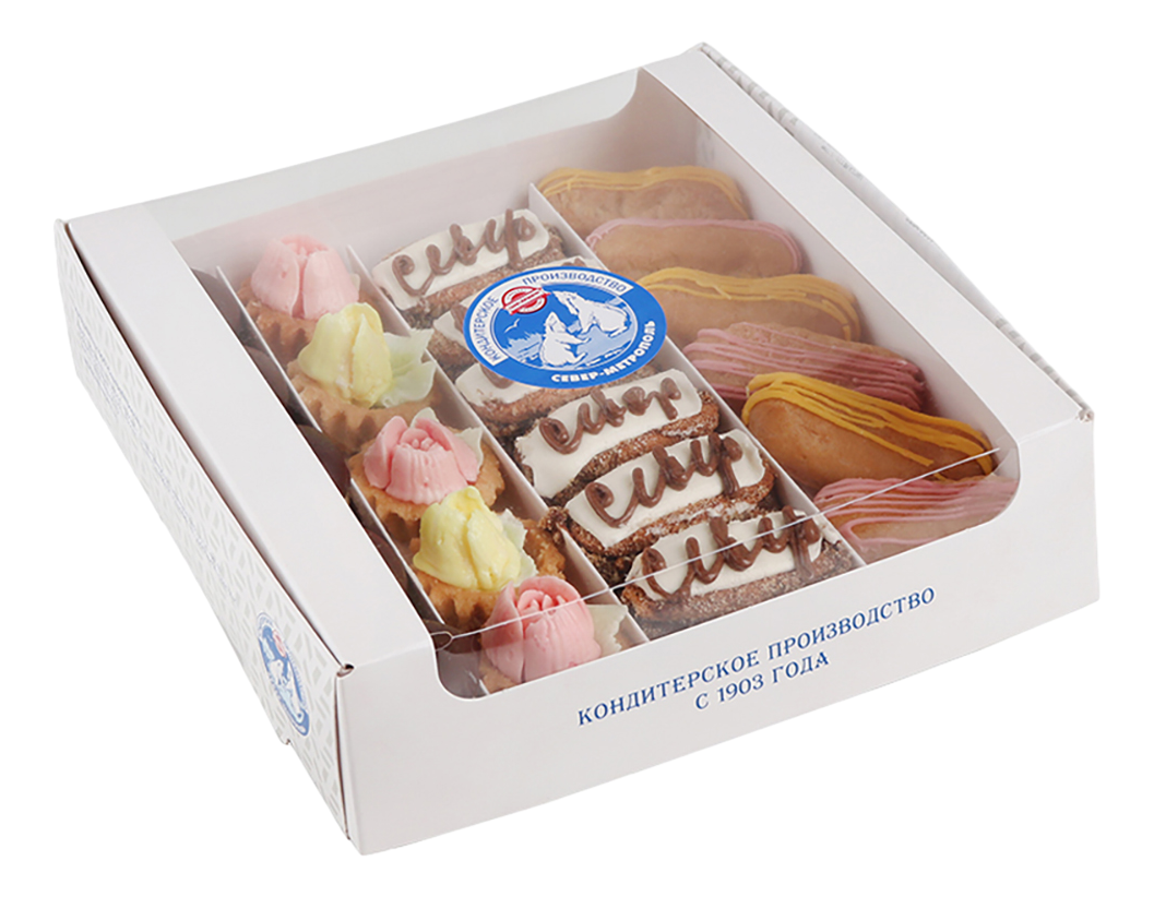 Набор, состоящий из мини пирожных: эклер - заварная трубочка со сливочным кремом, покрыта разноцветной кондитерской глазурью; песочная корзиночка с фруктовой начинкой и сливочным кремом; воздушно-ореховое пирожное Север с шоколадно-сливочным кремом; пирожное буше: два бисквита, пропитанных сиропом и прослоенных сливочным кремом, поверхность покрыта кондитерской глазурью. Фирменный набор десертов, состоящий из мини пирожных: эклер – заварная трубочка, наполнена сливочным кремом, покрыта разноцветной кондитерской глазурью; песочная корзиночка с фруктовой начинкой и сливочным кремом; воздушно-ореховое пирожное Север с шоколадно-сливочным кремом; пирожное буше: два бисквита, пропитанных сиропом и прослоенных сливочным кремом, поверхность покрыта кондитерской глазурью.