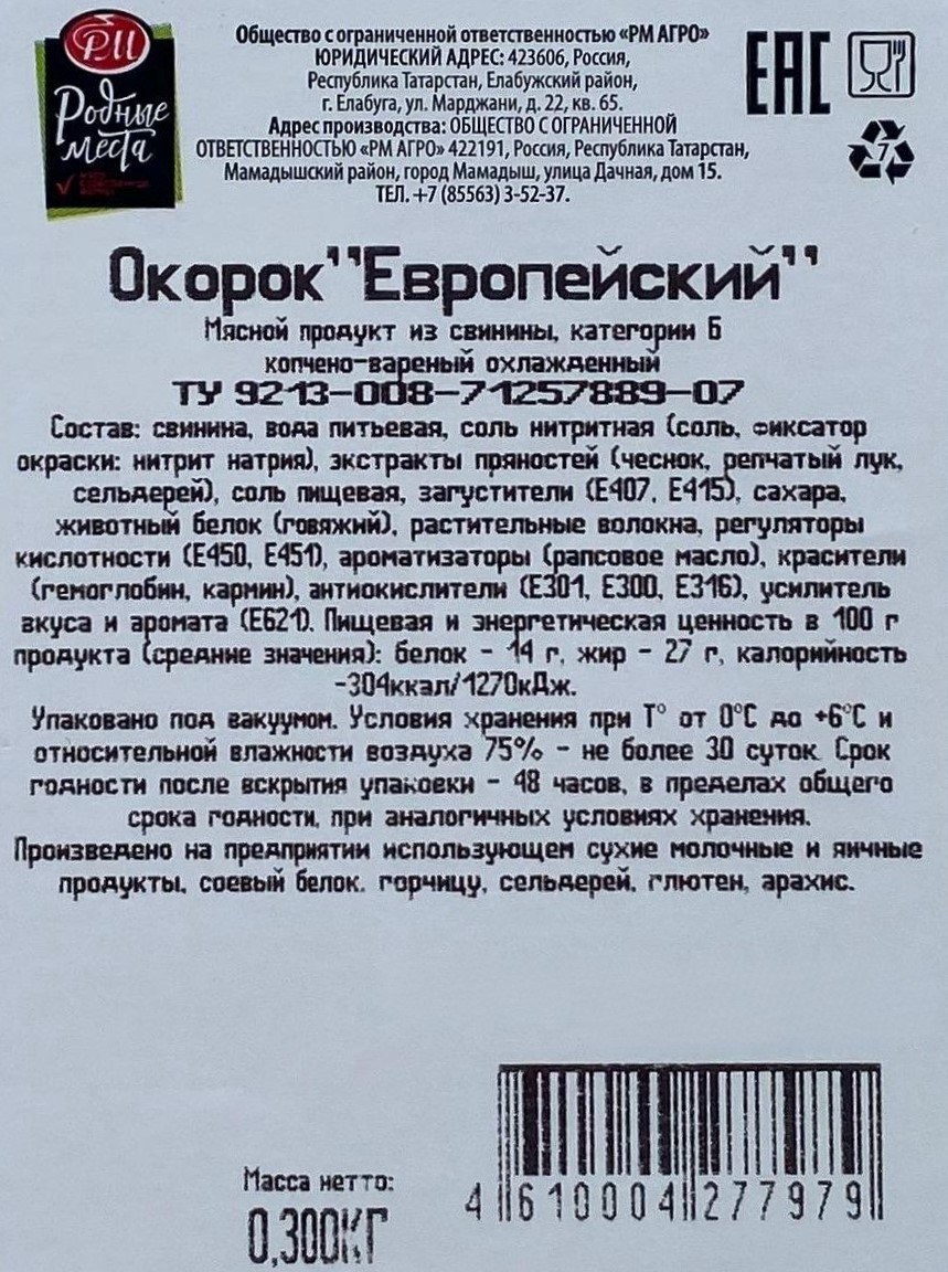Свинина, вода питьевая, соль нитритная (соль, фиксатор окраски: нитрит натрия, антислеживающий агент: ферроцианид натрия), стабилизаторы (трифосфаты, пирофосфаты), загустители (каррагинан, ксантановая камедь), сахара, животный белок (свиной), экстракты специй (чеснок, репчатый лук), растительные волокна, регуляторы кислотности (лактат натрия, ацетат натрия, цитрат натрия), антиокислители (аскорбат натрия, изоаскорбат натрия, аскорбиновая кислота, токоферолы), усилитель вкуса и аромата (глутамат натрия), краситель (гемоглобин, кармин).