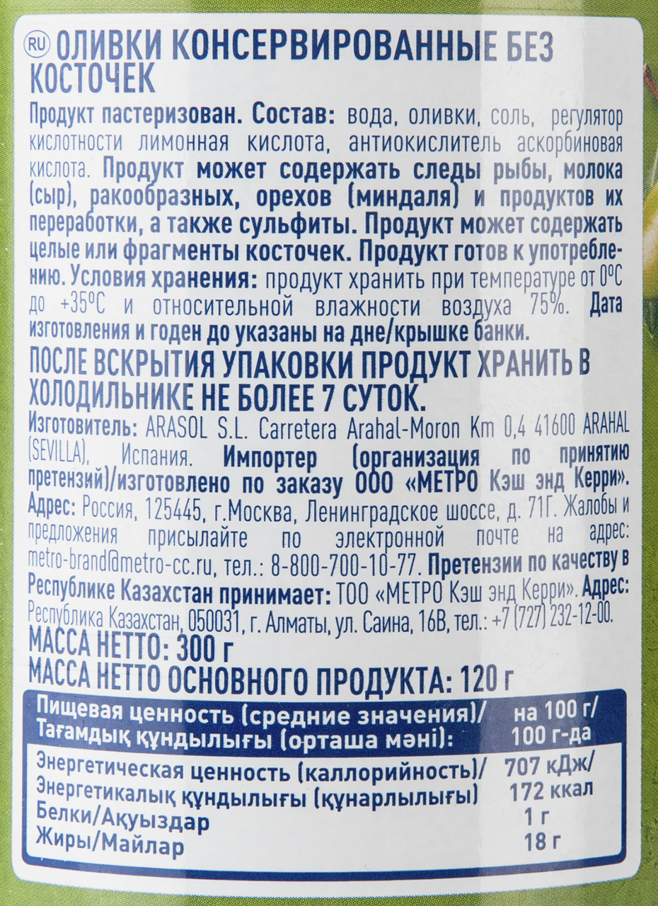 Вода, оливки, соль, регулятор кислотности лимонная кислота, антиокислитель аскорбиновая кислота.