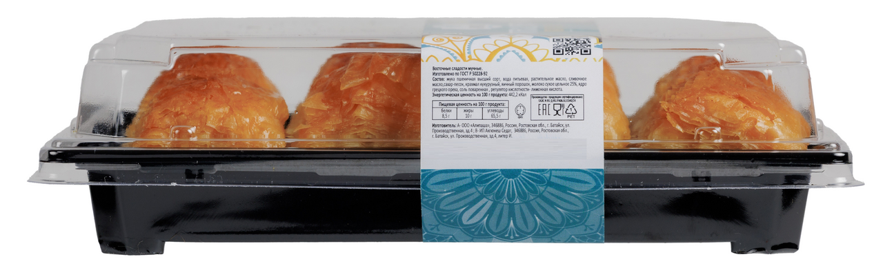 Традиционная восточная пахлава, изготовленная вручную по древнему рецепту. Лакомство из тонкого слоеного теста, пропитанного пряным сиропом с кардамоном и шафраном, начинено молотыми грецкими орехами в меду. Отличается изысканным вкусом.