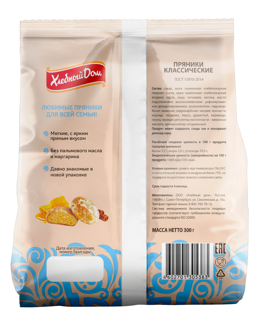 Сахар, мука пшеничная хлебопекарная первого сорта, мука пшеничная хлебопекарная второго сорта, вода питьевая, патока, масло подсолнечное высокоолеиновое рафинированное дезодорированное, разрыхлители: гидрокарбонат аммония, гидрокарбонат натрия, пряности: корица, гвоздика, перец душистый, кориандр, перец черный; регулятор кислотности – лимонная кислота, ароматизатор натуральный.