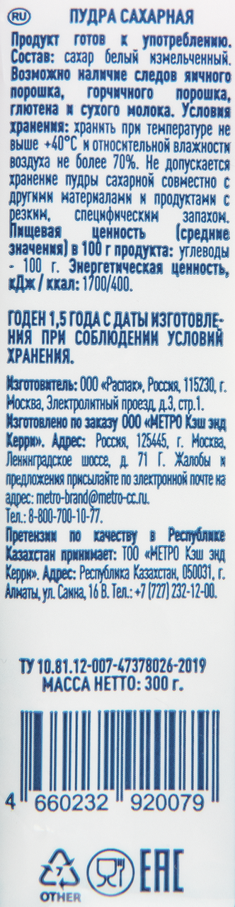 METRO Chef Пудра сахарная, 300г одинаково часто выступает и в роли ингредиента, и в роли украшения. Мелкий, перетертый в пыль сахар выгодно отличается от своей крупнокристаллической формы лучшей растворимостью, пудра не делает кремы тяжелыми, в отличие от обычного сахара, но при этом не дает белкам насытиться кислородом, как в меренгах. Для некоторых рецептов используют как сахар, так и сахарную пудру (например, в сиропах). Не стоит забывать и про декоративную значимость сахарной пудры: ей посыпают кексы, сдобу и десерты для украшения.