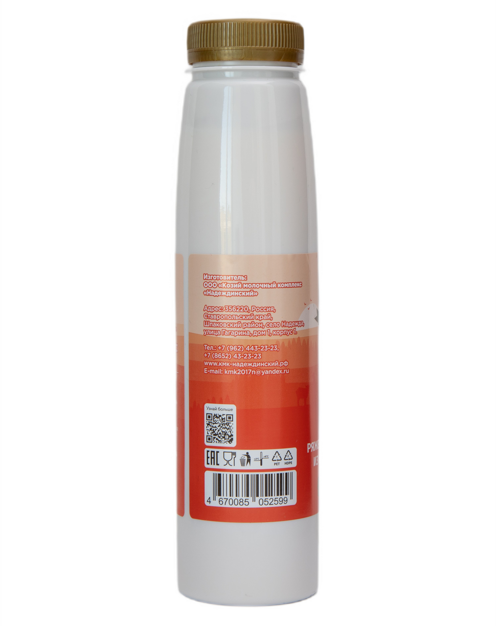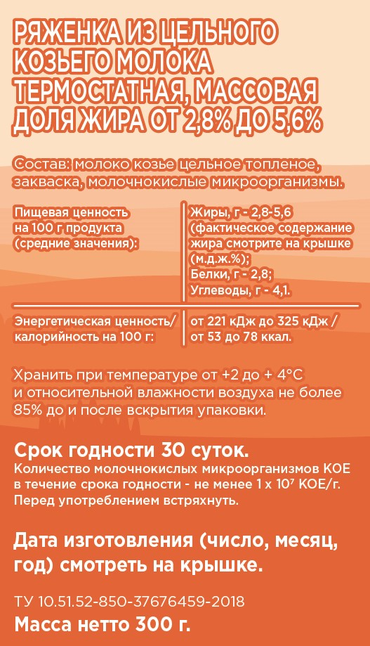 Ряженка из козьего молока от КМК Надеждинский - густая, нежная, теплого кремового цвета с характерным карамельным привкусом и ароматом топленого молока, идеальной консистенцией, нежным десертным вкусом, чистым составом. Этот напиток мы изготавливаем без применения стабилизаторов, красителей и ароматизаторов традиционным способом: топленое молочко заквашивается чистыми культурами Streptococcus Thermophilus в термостате прямо в бутылочке.
