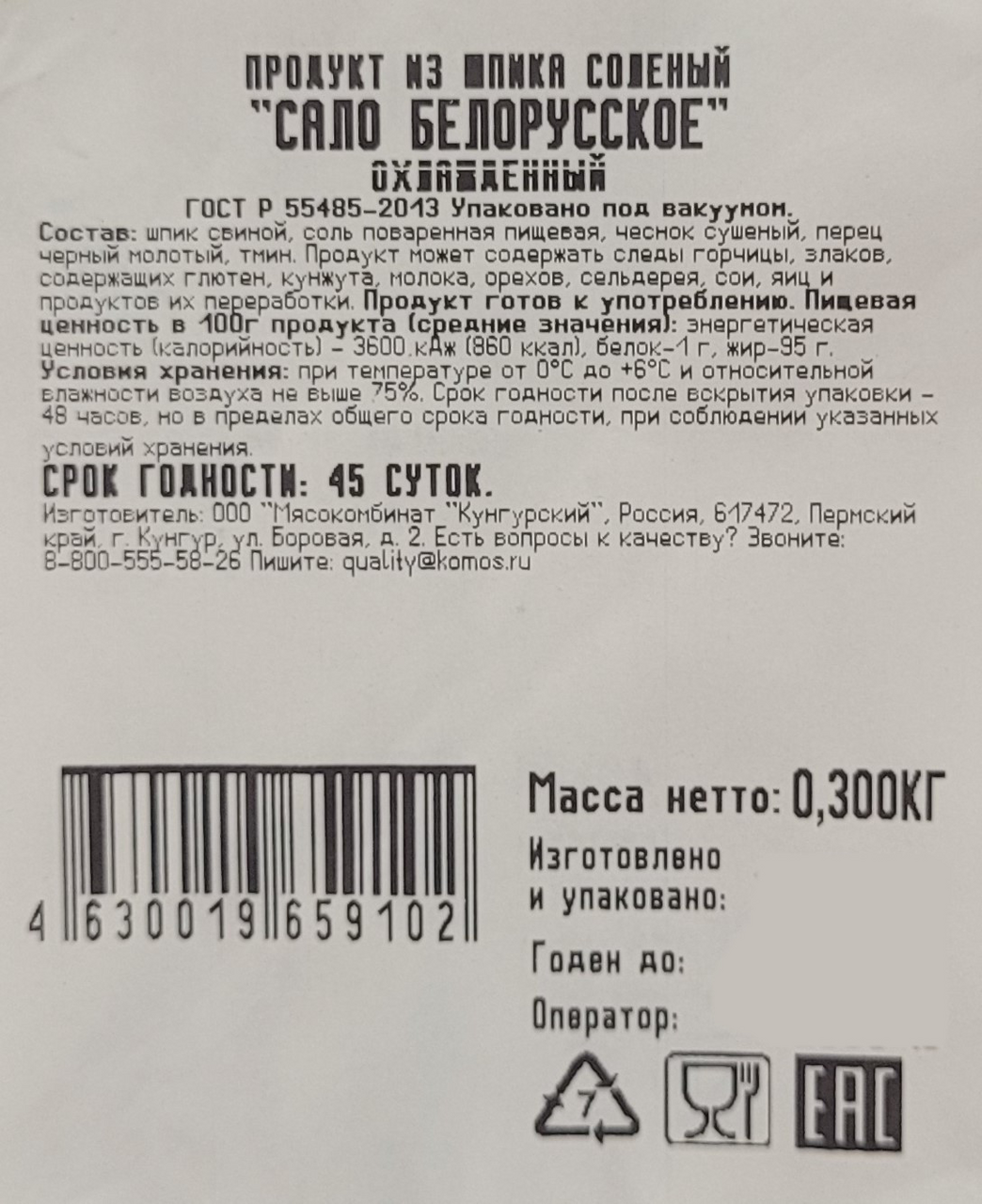 Шпик свиной, соль поваренная пищевая, чеснок сушеный, перец черный молотый, тмин.