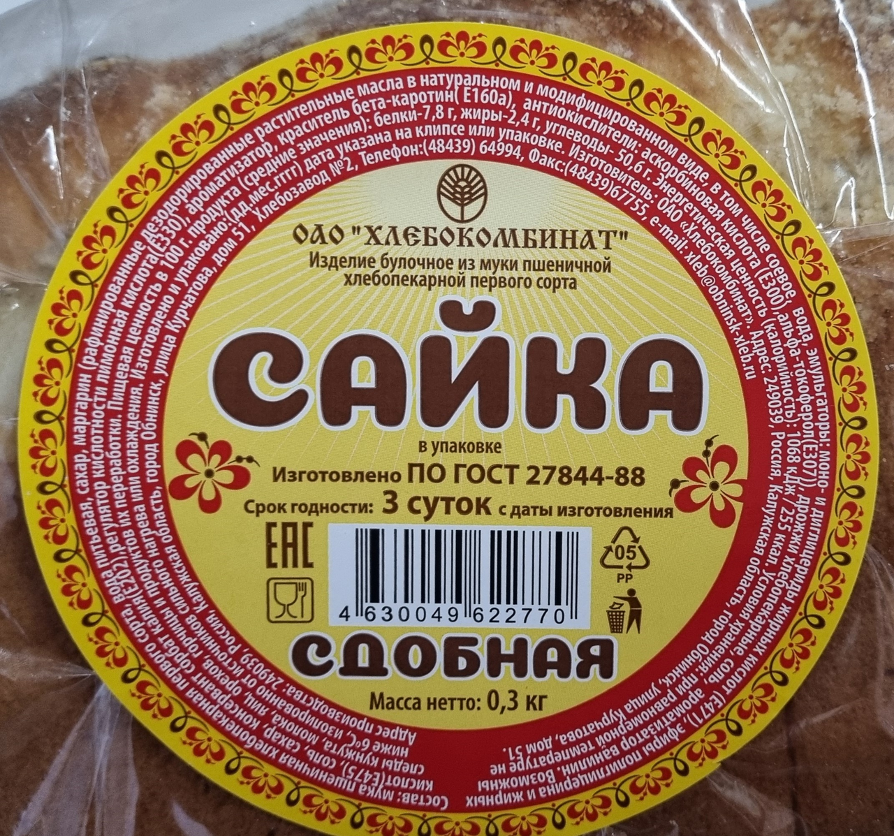 Изделие булочное из муки пшеничной первого сорта. Пышная и очень вкусная сайка подходит для употребления с чаем или молоком.
