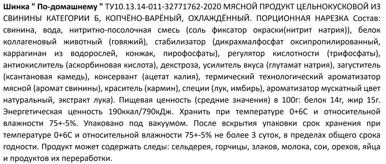 Свинина, вода, нитритно-посолочная смесь соль, фиксатор окраски, белок коллагеновый животный, стабилизатор, регулятор кислотности, антиокислитель, декстроза, усилитель вкуса, загуститель, консервант, ароматизатор мясной, краситель, специи.
