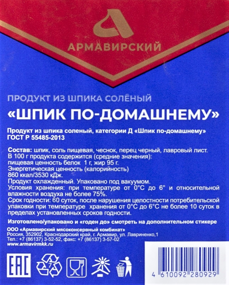 Это традиционное блюдо для многих людей. Вкус его зависит от рецепта засолки или маринада. Для получения максимально натурального ароматного шпика с нежными прослойками мяса используется только чеснок, черный перец и соль. Сверху кусочки шпика натираются черным молотым перцем.