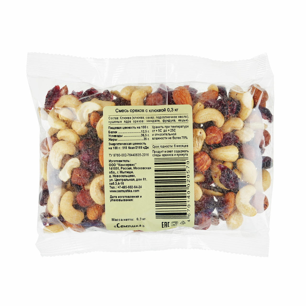 Клюква (клюква, сахар, подсолнечное масло, регулятор кислотности лимонная кислота), сушёные ядра орехов миндаля, фундука, кешью.