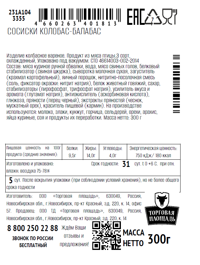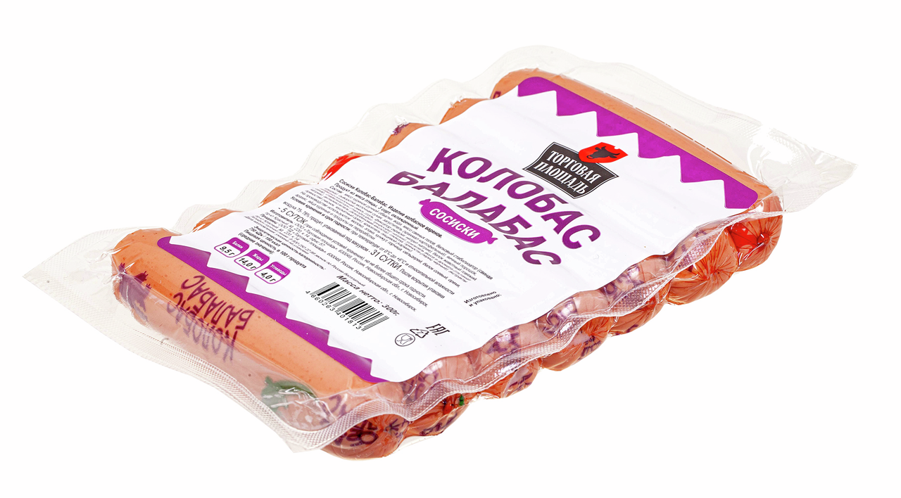 Сосиски Торговая площадь Колобас-Балабас вареные очень нравятся детям. Специально для маленьких потребителей был разработан максимально натуральный состав, в который входят молоко, яйца, сливочное масло. Сосиски изготавливаются на пару, что делает их еще полезнее для детей.