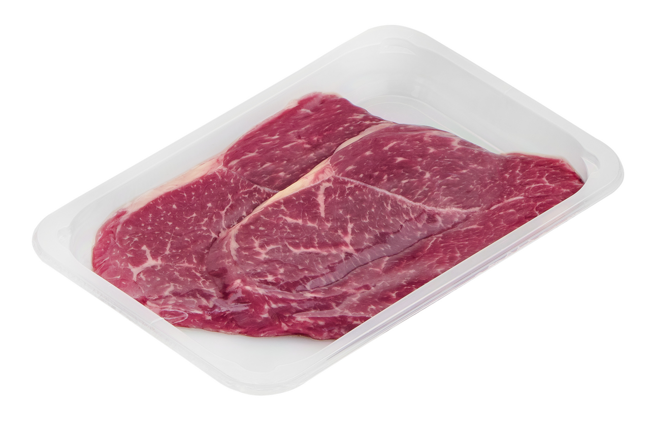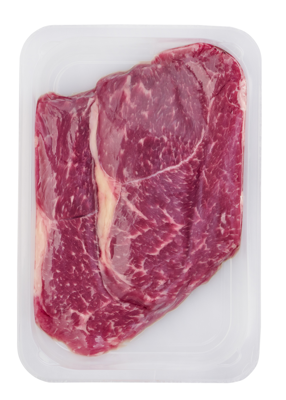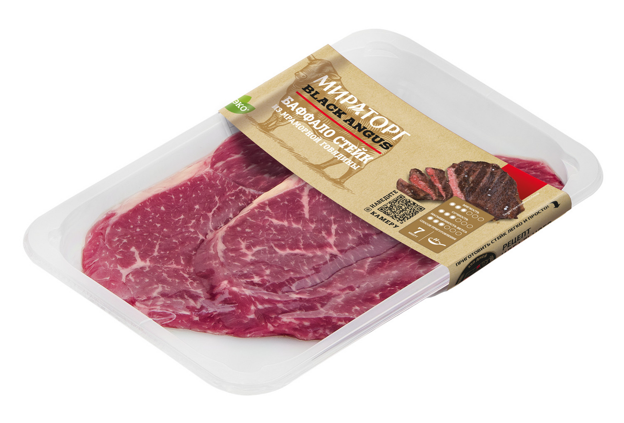 Полуфабрикат мясной, мелкокусковой, охлажденный. Сделан из мяса молодых бычков одной из лучших пород в мире. Он отличается высокой мраморностью, которая образуется благодаря мелким жировым прослойкам, напоминающим рисунок мрамора. Баффало стейк относится к группе традиционных стейков. Он нарезается из особой части лопатки. Благодаря мраморности стейк получается сочным и обладает насыщенным вкусом. Эти вкрапления и улучшают его вкус - мясо обладает особой сочностью, нежностью и ароматом.