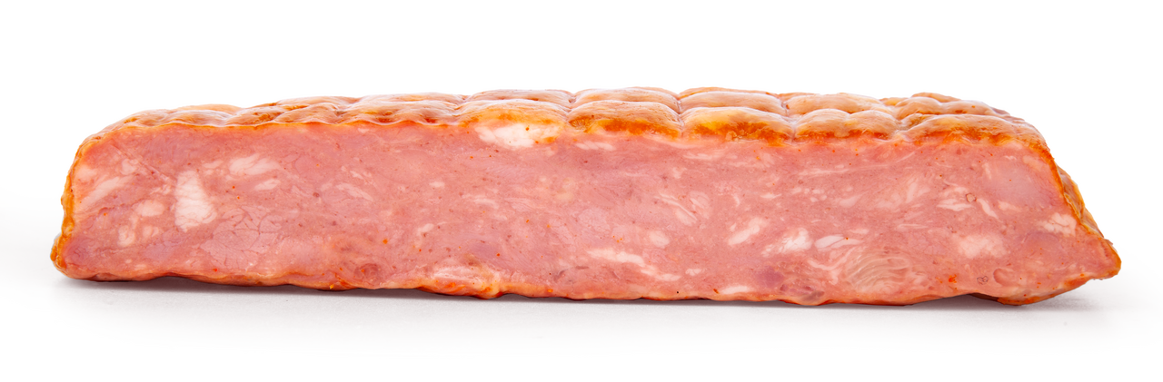 Это крупноизмельченный ветчинный продукт в форме. Характеризуется сочностью, превосходным мясным вкусом, натуральными пряностями. Дополняет картину естественно натуральное копчение.