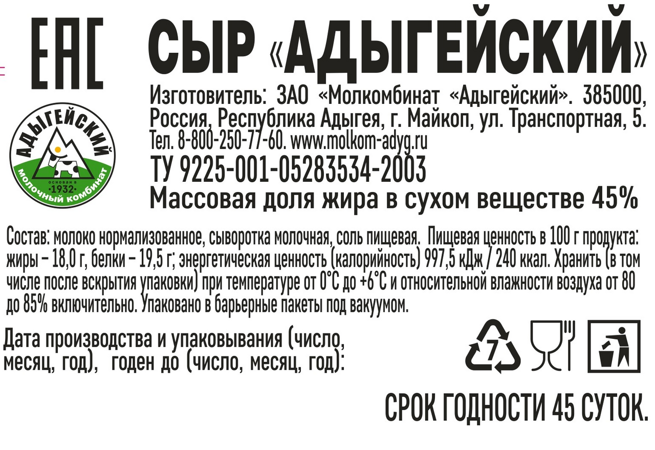 Сыр Майкопский Пз Адыгейский 45%, 300г