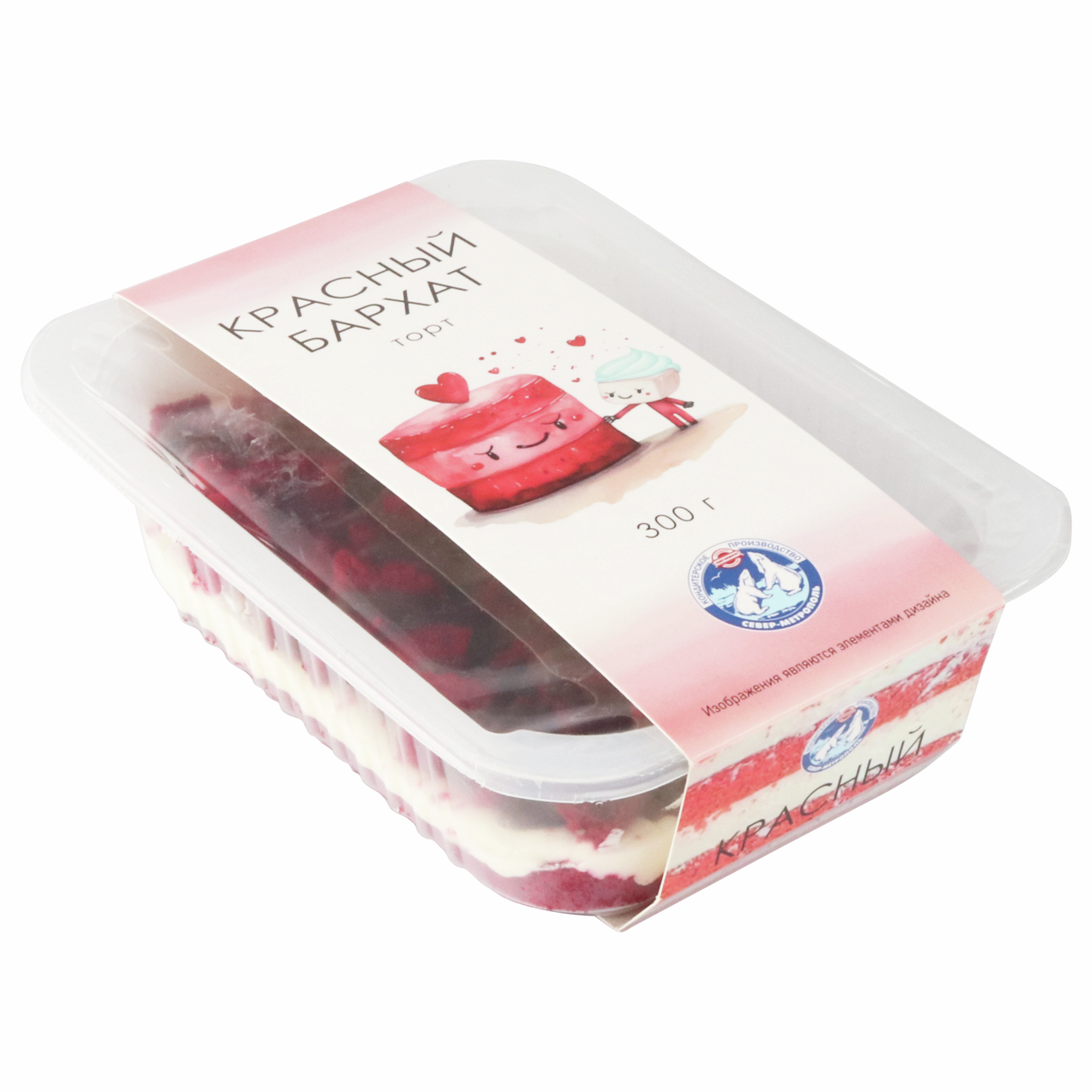 Состоит из бисквита Красный бархат на кефире, прослоен сырным кремом. Поверхность заштрихована шоколадным ганашем. Можно употреблять в качестве десерта к чаю или использовать в качестве презента к столу.