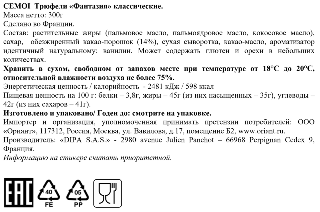 Классические трюфели Cemoi с их изысканным вкусом, в котором легкая горчинка раскрывается нежной сладостью, доставят истинное удовольствие любителям французских десертов. В трюфельной Фантазии содержится не менее 14% какао-порошка и какао-масло. Конфеты обладают притягательным ароматом и характерной мягкой текстурой, упакованы в жестяную коробку. Они станут достойным подарком.