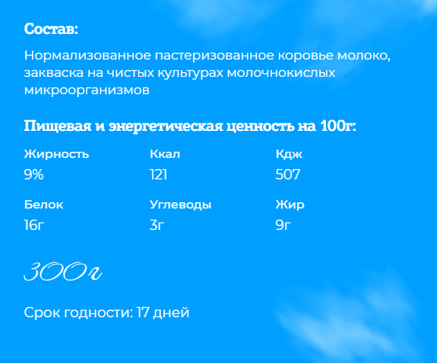 Нормализованное пастеризованное коровье молоко, закваска на чистых культурах молочнокислых микроорганизмов.