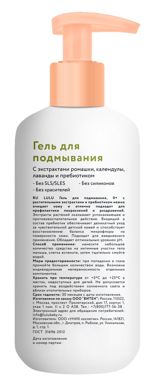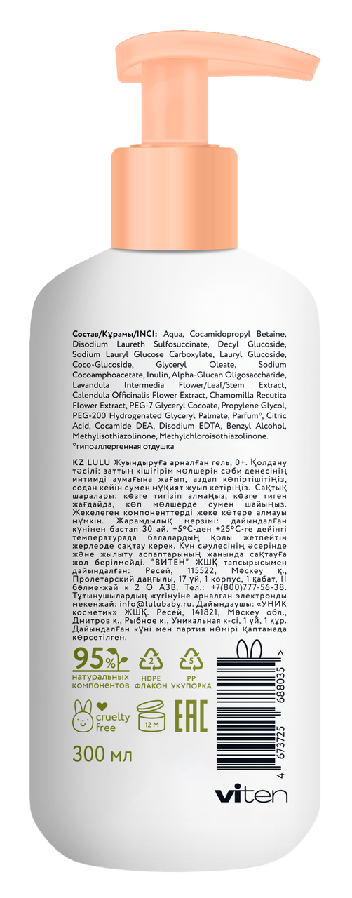 Средство для подмывания малыша с растительными экстрактами и пребиотиком нежно очищает кожу и отлично подходит для профилактики покраснений и раздражений. Экстракты растений оказывают успокаивающее и противовоспалительное действие. Входящий в состав пребиотик обеспечивает деликатный уход за чувствительной детской кожей и способствует восстановлению баланса микрофлоры на поверхности кожи. Подходит для ежедневного применения. Обладает оптимальным уровнем pH.Обращаем Ваше внимание, что все средства линейки Lulu не содержат сульфаты, поэтому пенятся значительно меньше. Ведь именно сульфаты при контакте с водой образуют много пены.За счет жидкой консистенции средства оно полностью и очень легко смывается, не причиняя дискомфорта малышу. Все средства Lulu имеют легкий аромат, который после купания чуть уловим на коже и волосах малыша.Способ применения: нанесите небольшое количество средства на интимные участки тела малыша, слегка вспеньте, затем тщательно смойте водой.