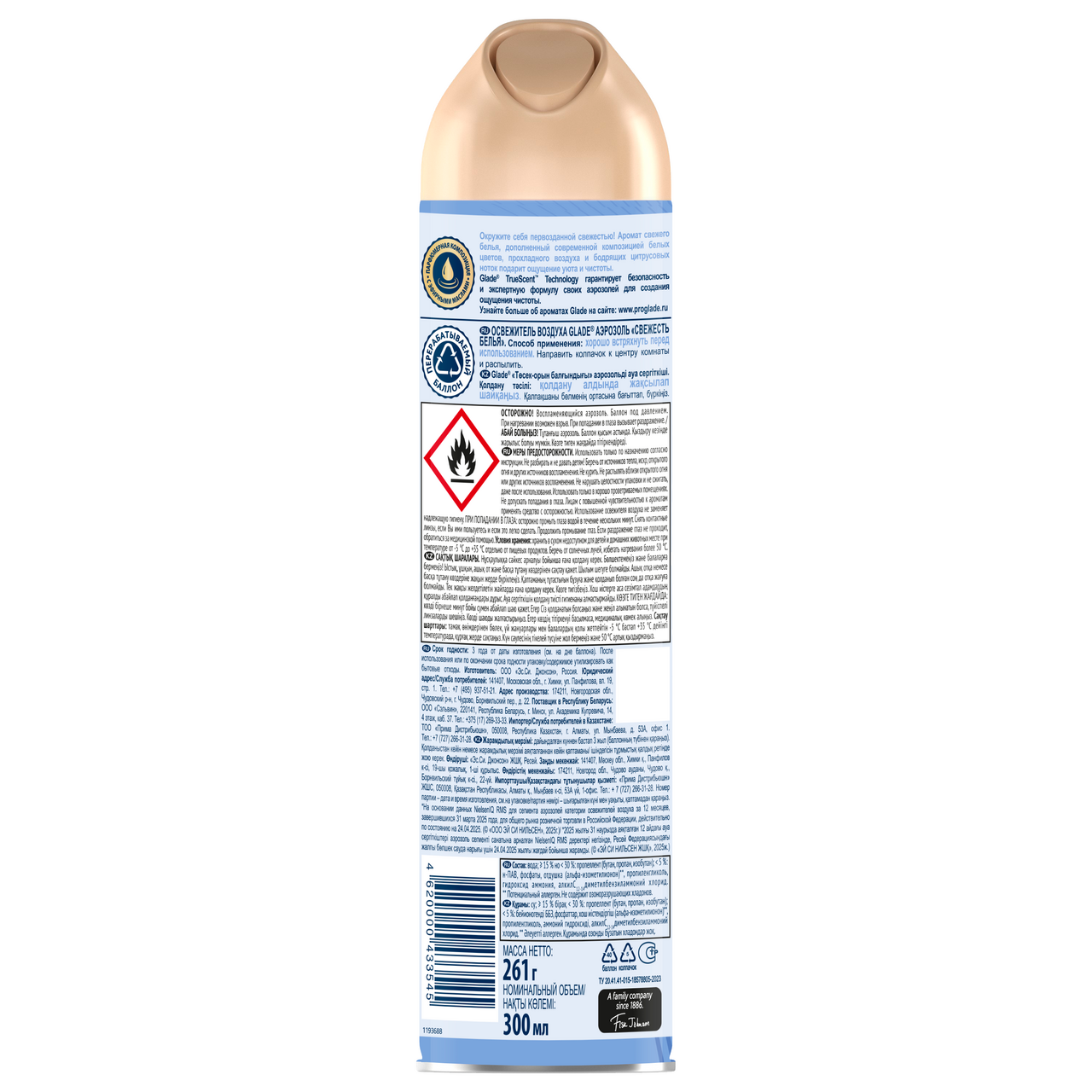Аромат свежего белья, дополненный современной композицией белых цветов, прохладного воздуха и бодрящих цитрусовых ноток. Glade TrueScent Technology гарантирует безопасность и экспертную формулу своих аэрозолей для создания ощущения чистоты.