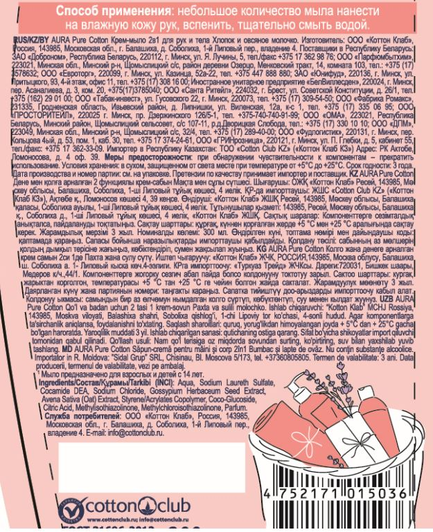 Крем-мыло Aura Pure Cotton 2в1 хлопок, 300мл