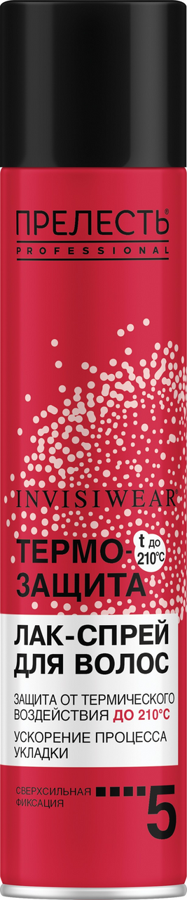 При частом использовании термических приборов для стайлинга или сушки волос, локоны тускнеют, теряют свой цвет, естественную упругость и становятся сухими и ломкими.С помощью лака для волос Прелесть Professional Invisiwear Термозащита можно оградить их от влияния высоких температур (до 210C) и уложить, зафиксировав форму до 24 часов.В составе лака-спрея пантенол, который питает и увлажняет волосы, восстанавливая их структуру. Силиконы, полностью обволакивают каждый волосок, защищая от воздействия высокой температуры по всей длине. Спрей можно наносить как на сухие, так и на влажные пряди для последующей завивки или выпрямления.В результате применения линейки средств Прелесть Professional Invisiwear Термозащита лак и мусс, волосы в 5,7 раз меньше ломаются и портятся от укладки с термическими приборами, выглядят здоровыми и гладкими.