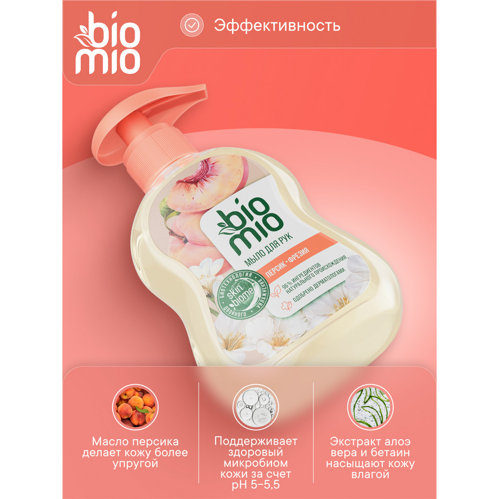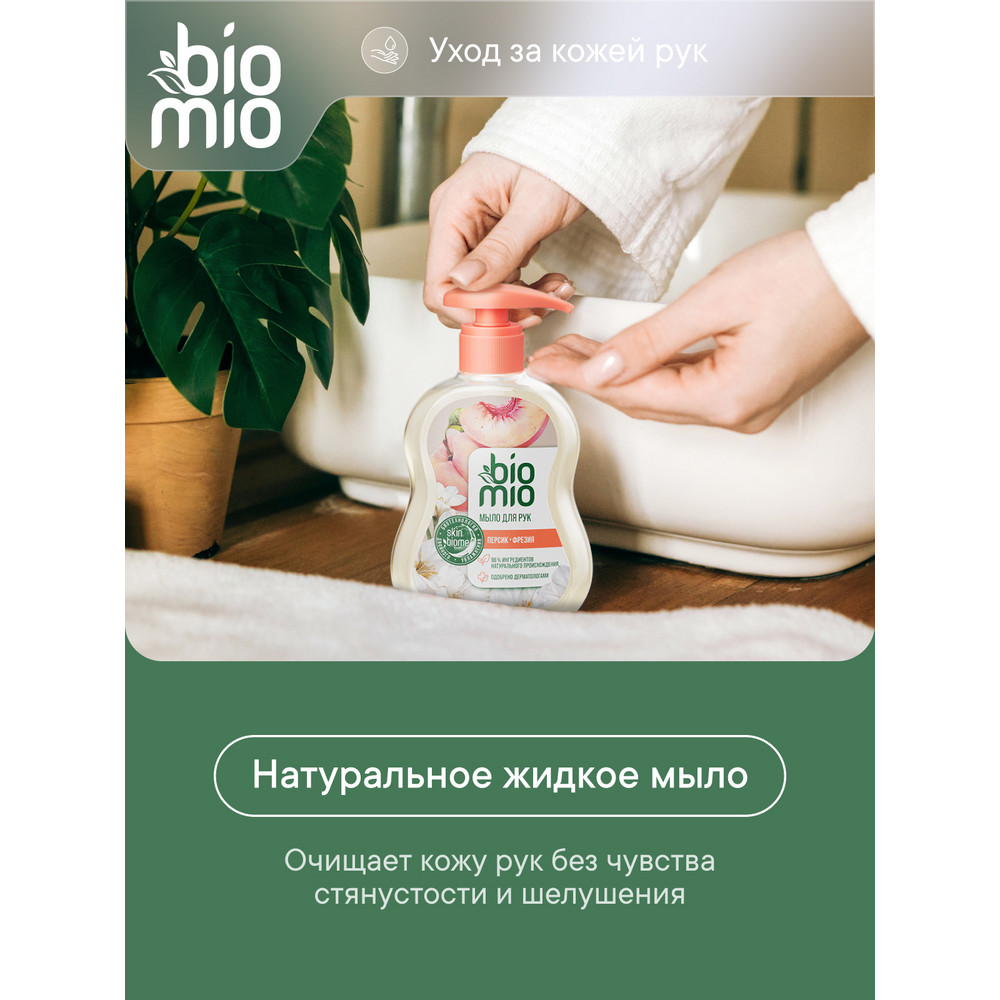 Гипоаллергенное натуральное жидкое мыло Biomio персик-фрезия мягко и деликатно очищает и одновременно увлажняет кожу рук. На 96% состоит из натуральных ингредиентов.Масло персика делает кожу более упругой!