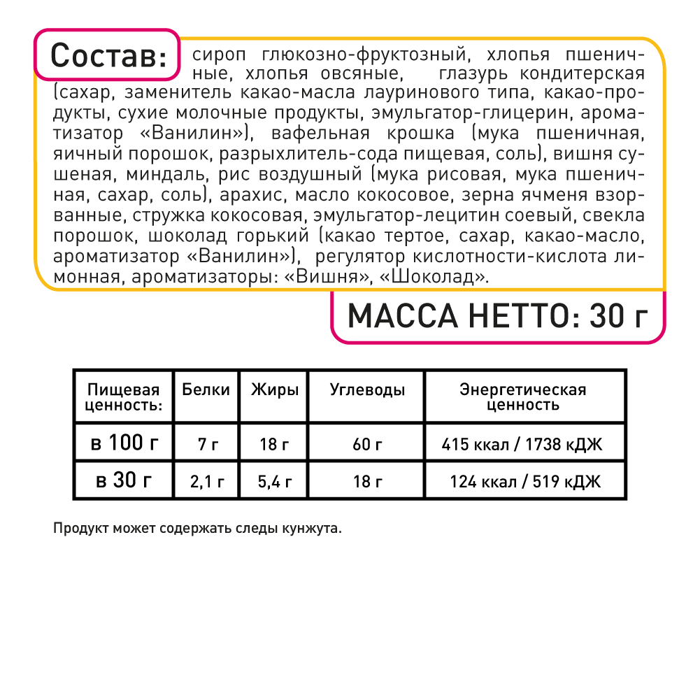 Сироп глюкозно-фруктозный, хлопья пшеничные, хлопья овсяные, глазурь кондитерская (сахар, заменитель какао-масла лауринового типа, какао-продукты, сухие молочные продукты, эмульгатор-глицерин, ароматизатор Ванилин), вафельная крошка (мука пшеничная, яичный порошок, разрыхлитель-сода пищевая, соль), вишня сушеная, миндаль, рис воздушный (мука рисовая, мука пшеничная, сахар, соль), арахис, масло кокосовое, зерна ячменя взорванные, стружка кокосовая, эмульгатор-лецитин соевый, свекла порошок, шоколад горький (какао тертое, сахар, какао-масло, ароматизатор Ванилин), регулятор кислотности-кислота лимонная, ароматизаторы: Вишня, Шоколад. Продукт может содержать следы кунжута. Продукт готов к употреблению.