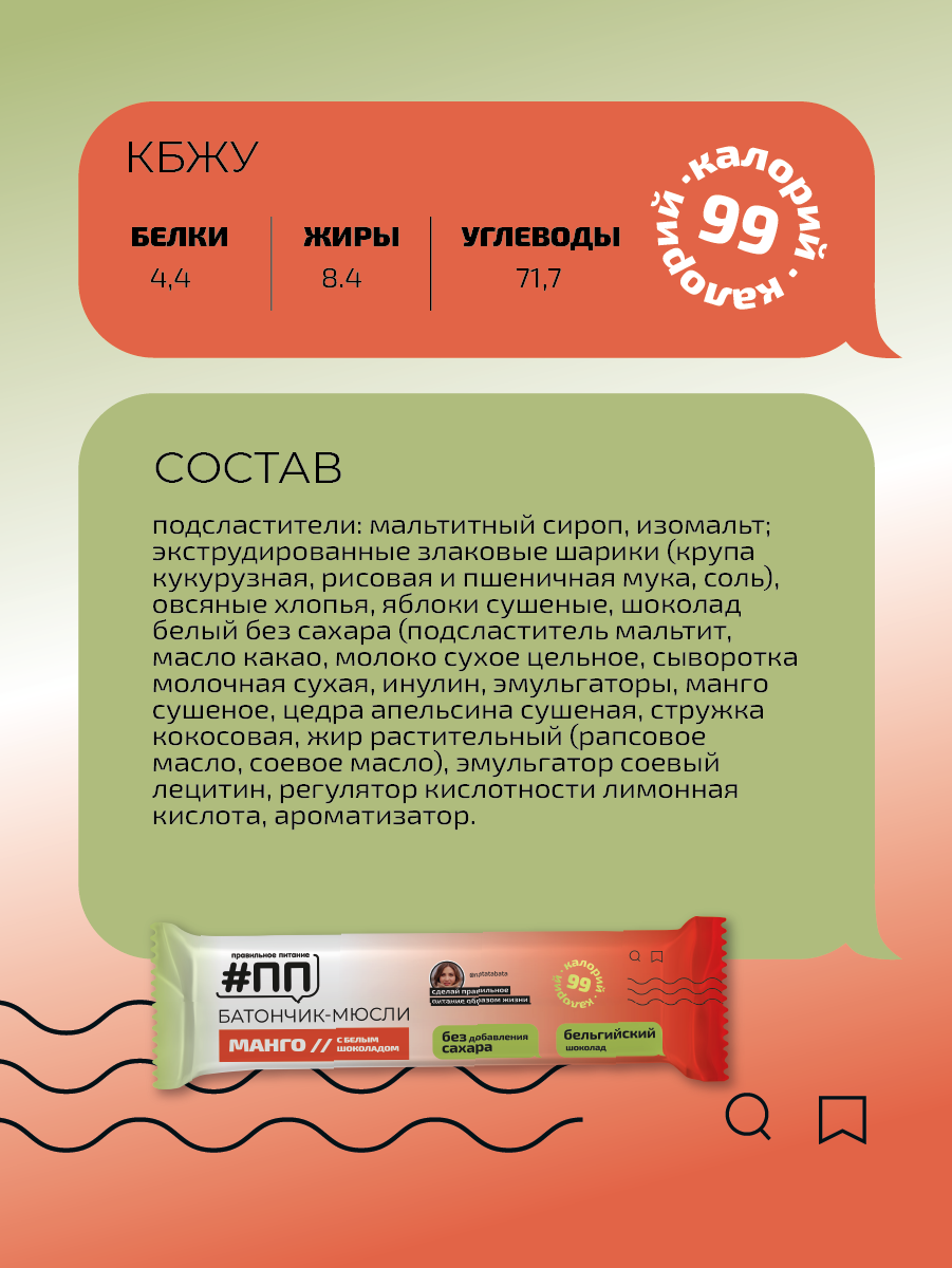 Подсластители: мальтитный сироп, изомальт, экструдированные злаковые шарики (крупа кукурузная, рисовая и пшеничная мука, соль), овсяные хлопья, яблоки сушеные, шоколад белый без сахара (подсластитель мальтит, масло какао, молоко сухое цельное, сыворотка молочная сухая, инулин, эмульгаторы (соевый лецитин, е476), экстракт ванили), манго сушеное, цедра апельсина сушеная, стружка кокосовая, жир растительный (рапсовое масло, соевое масло), эмульгатор соевый лецитин, регулятор кислотности лимонная кислота, ароматизатор.